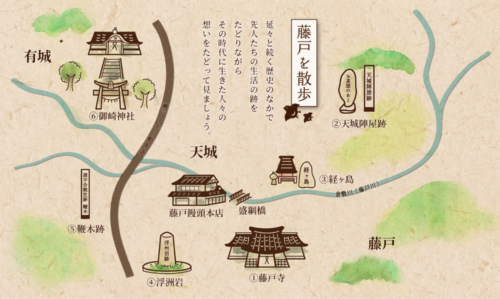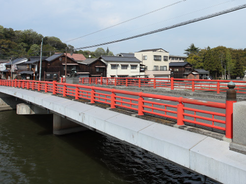 藤戸・天城の架橋は正保4年(1647)に始まり、この地は四国往来の要衝、また川湊として栄えていた。大正15年、舟運を考慮して無橋脚のトラス橋を建設。源平藤戸合戦で先陣の名声を挙げた源氏の猛将佐々木盛綱にちなみ、「盛綱橋」と命名。現在の橋は平成元年に建てられ、今もなお親しまれている。