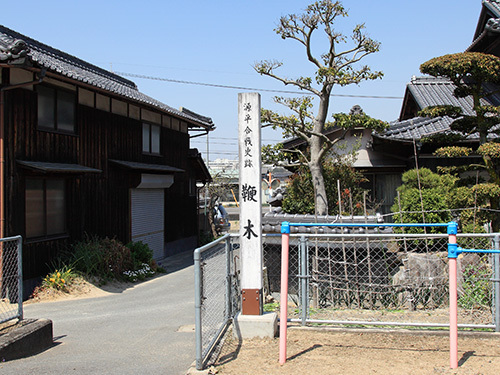 藤戸合戦の際に平家の陣に向かって海に馬を進めた佐々木盛綱が、小高くなった中州で持っていた鞭を海底に刺して馬を休めていたが、そのまま忘れて対岸に攻め入ってしまった。その鞭が根付いて巨木に育ち、地名となったと言われている。藤戸寺には江戸時代に枯れたこの木を利用して、文政10年天城藩士山脇十二郎が彫刻した佐々木盛綱像がある。
