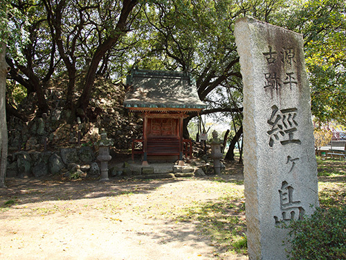 もともとは藤戸寺の境内であった小さな島に、佐々木盛綱によって行われた大法要で写経した経を埋めて経塚(宝篋印塔(ほうきょういんとう))を建てたことから、「経ヶ島」と呼ばれるようになった。